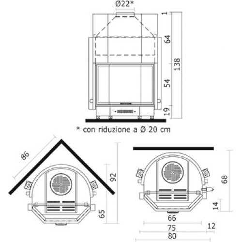 Топка с водяным контуром из толстой стали, способная производить горячую воду, поступающую в контур системы отопления и на радиаторы, а также производить горячую техническую воду. Дверца призматической формы с подъемом вверх. Камин может устанавливаться как пристенный или как фронтальный.