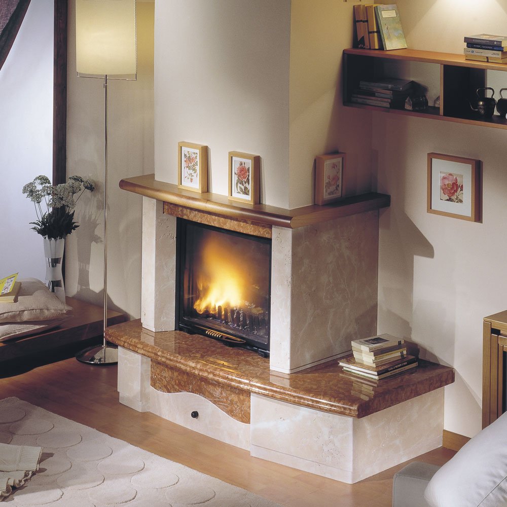 Пристенная модель с плитой из красного веронского мрамора, декоративный цоколь и балка из дерева.